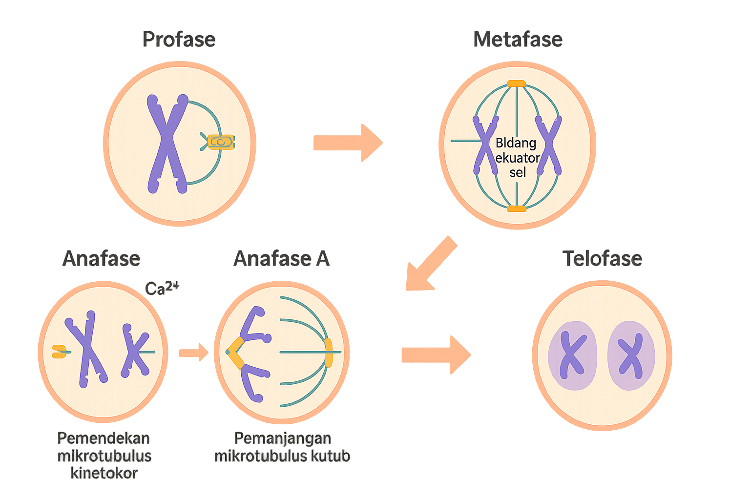 - Anafase A: Terjadi pemendekan mikrotubulus kinetokor yang menarik kromosom ke arah kutub.
