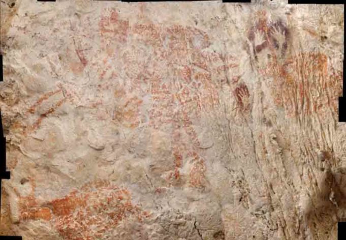 Dari berbagai jenis karya seni yang telah ditemakan di gua tersebut, stensil tangan [teknik seni yang menggunakan cetakan sebagai alat utamanya] yang dibuat dengan serupa pigmen merah memiliki usia dengan jangka waktu yang panjang. Satu di antaranya memiliki usia maksimum 51.800 tahun, sementara dua lainnya berusia minimal 37.200 tahun.