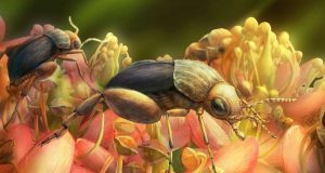 Seekor kumbang tak berdaya dengan serbuk sari yang masih menempel pada kaki-kakinya telah terawetkan dalam sebuah ambar sejak 99 juta tahun yang lalu, menjadi...