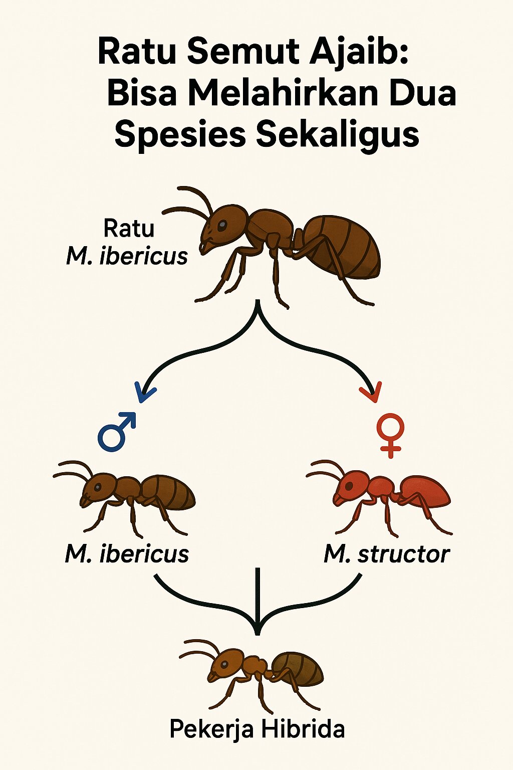 Semut ini bernama Messor ibericus, atau semut panen Iberia. Para ilmuwan menemukan bahwa ratu semut ini punya kemampuan reproduksi yang benar-benar unik di dunia hewan: ia bisa menghasilkan keturunan dari spesiesnya sendiri, sekaligus dari spesies lain yang bernama Messor structor – padahal spesies itu sudah tidak ada di sekitar habitatnya.